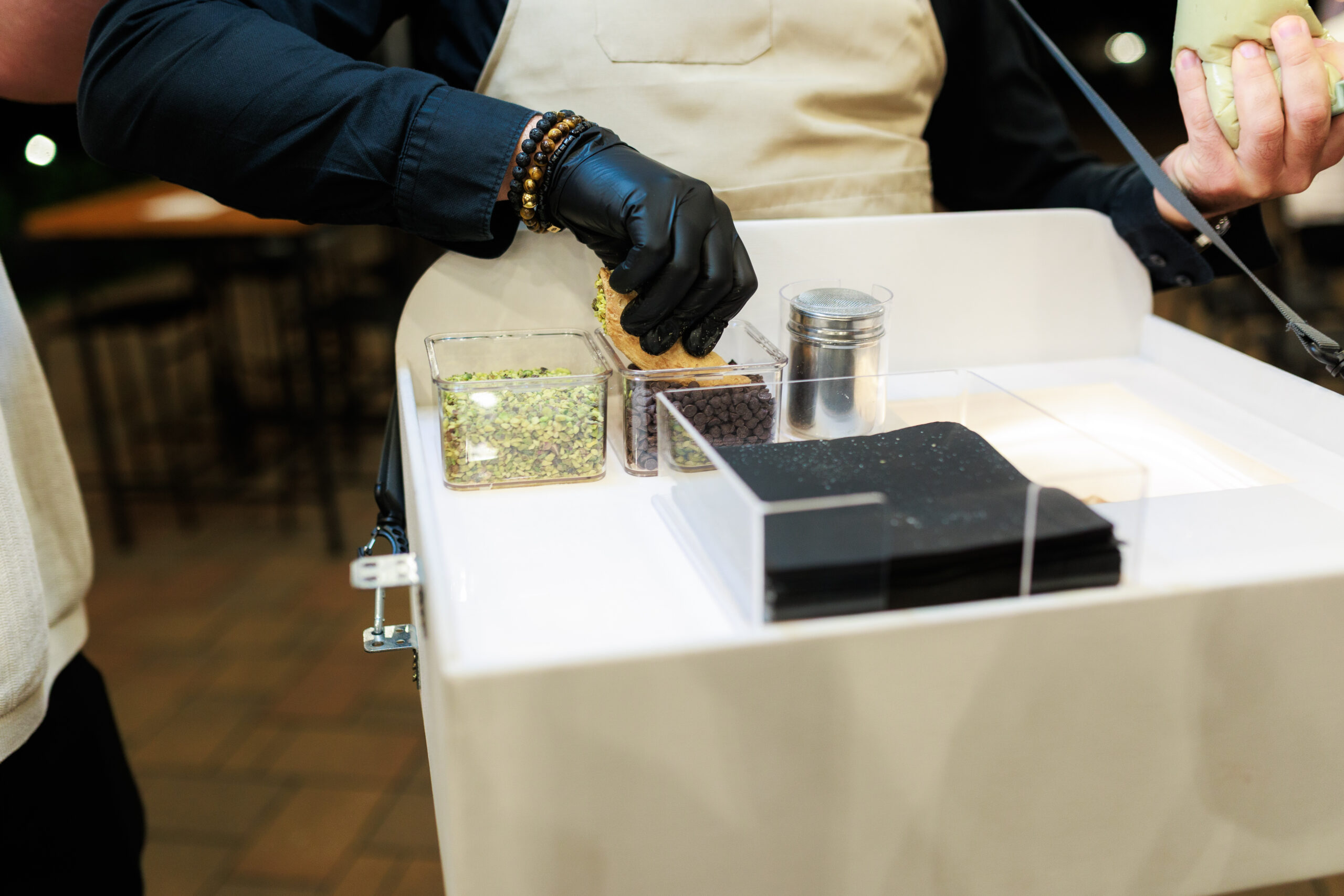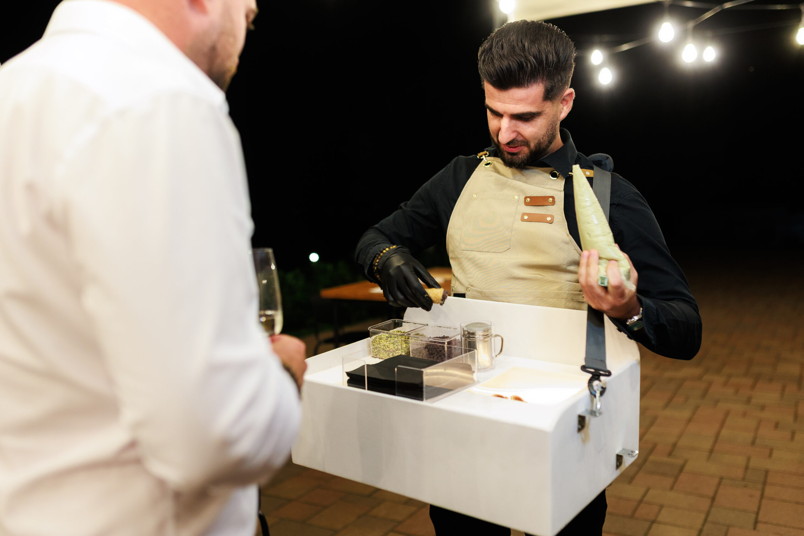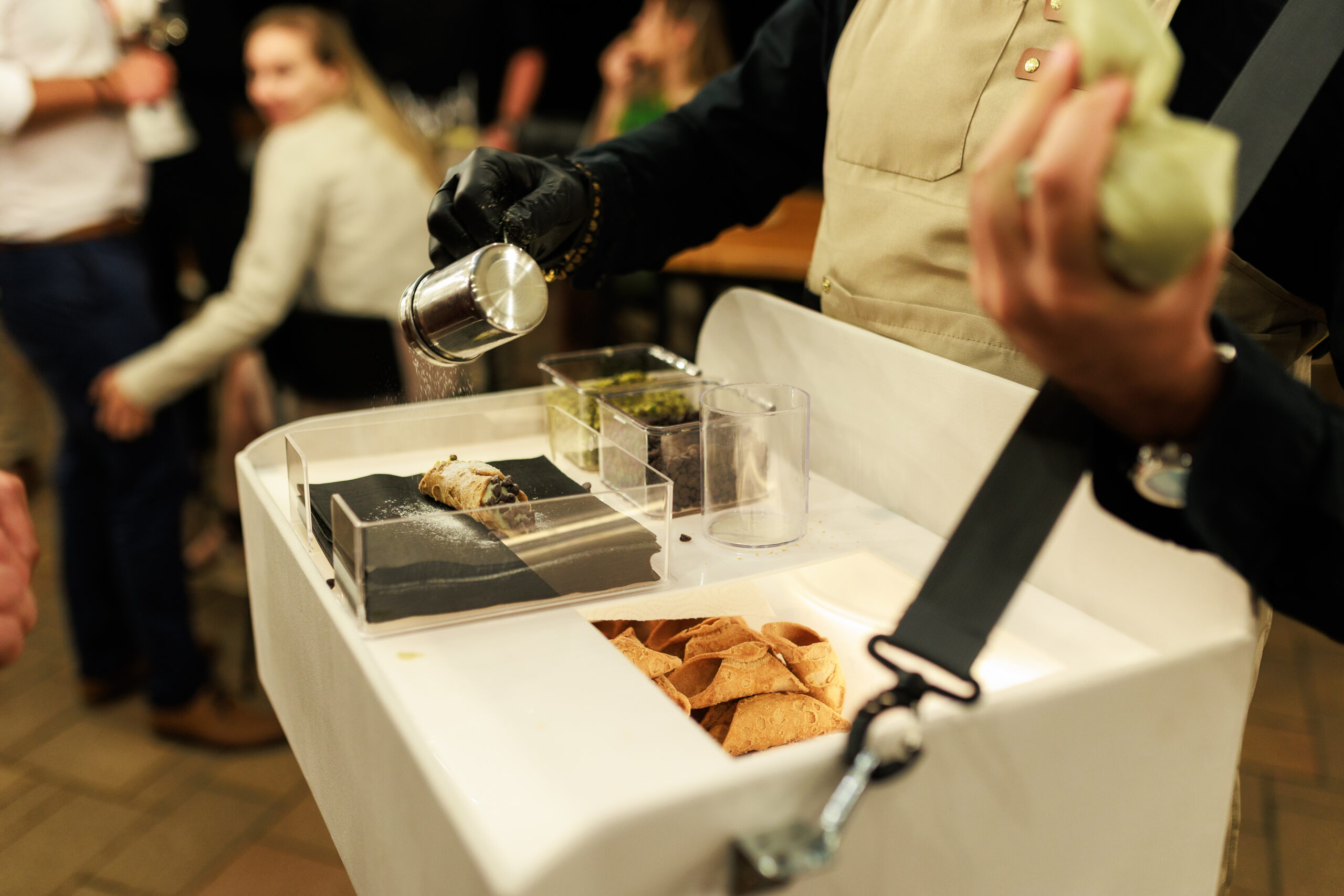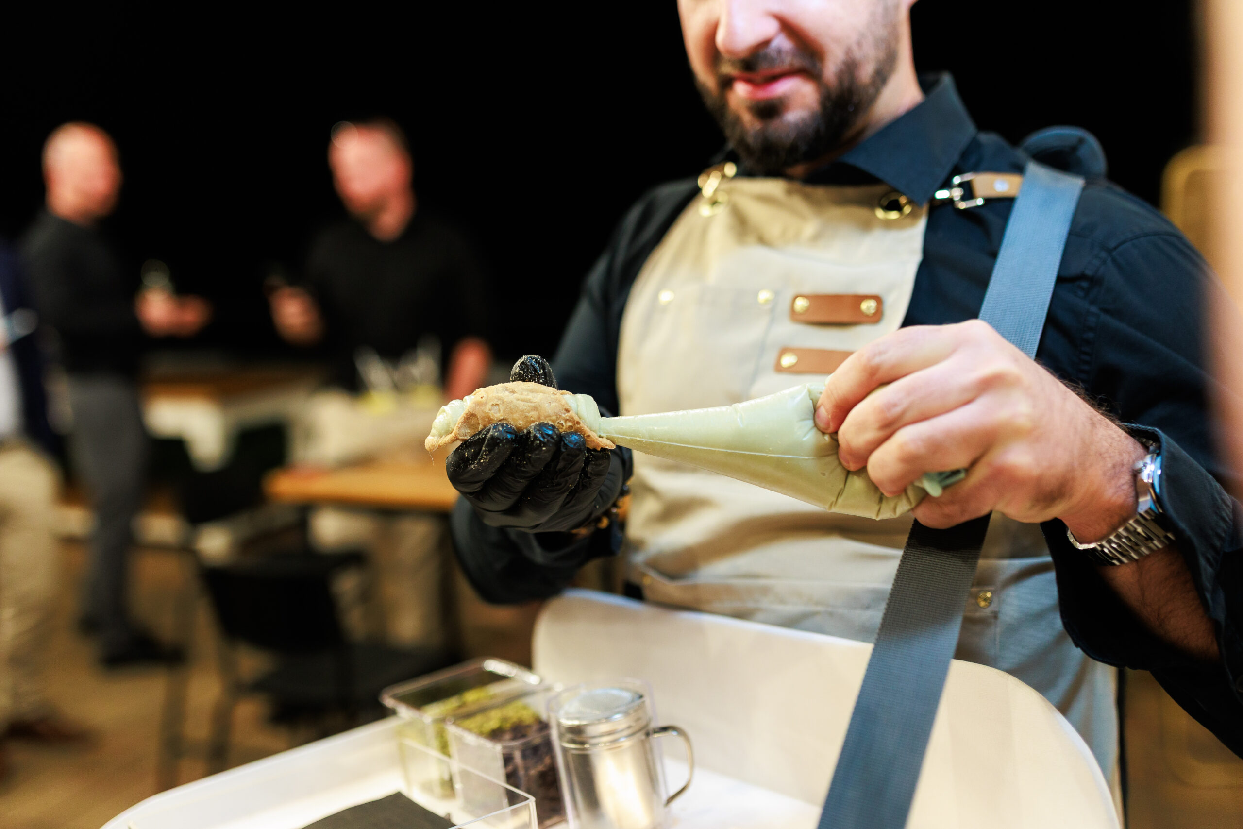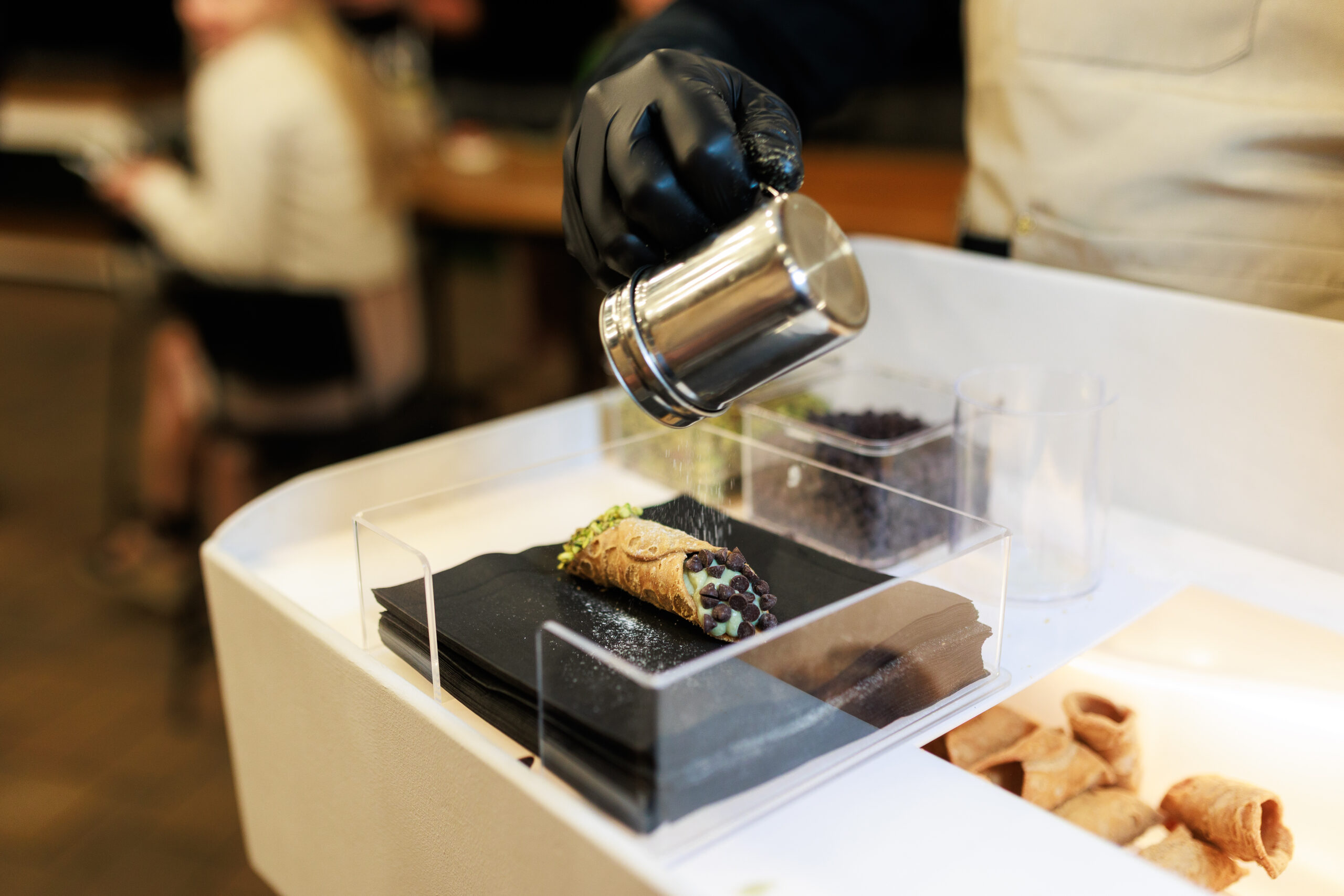 Mi élőben töltjük a cannolikat a vendégek előtt, így a roppanós tészta és a krémes töltelék találkozása igazi show-élményt nyújt.